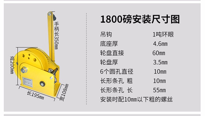 查看詳情咨詢電話:13933276606產(chǎn)品名稱:自鎖手動(dòng)絞盤1800LBS;型號(hào)規(guī)格:本手動(dòng)絞盤型號(hào)為自帶剎車式,根據(jù)拉力不同,可分為1200LBS、1800LBS和2600LBS等三種規(guī)格;其中,根據(jù)是否配置鋼絲繩及吊鉤又可分為裸機(jī)和全機(jī)兩種(裸機(jī)一種拉力對(duì)應(yīng)一種裸機(jī),全機(jī)規(guī)格如下文所述);1200LB